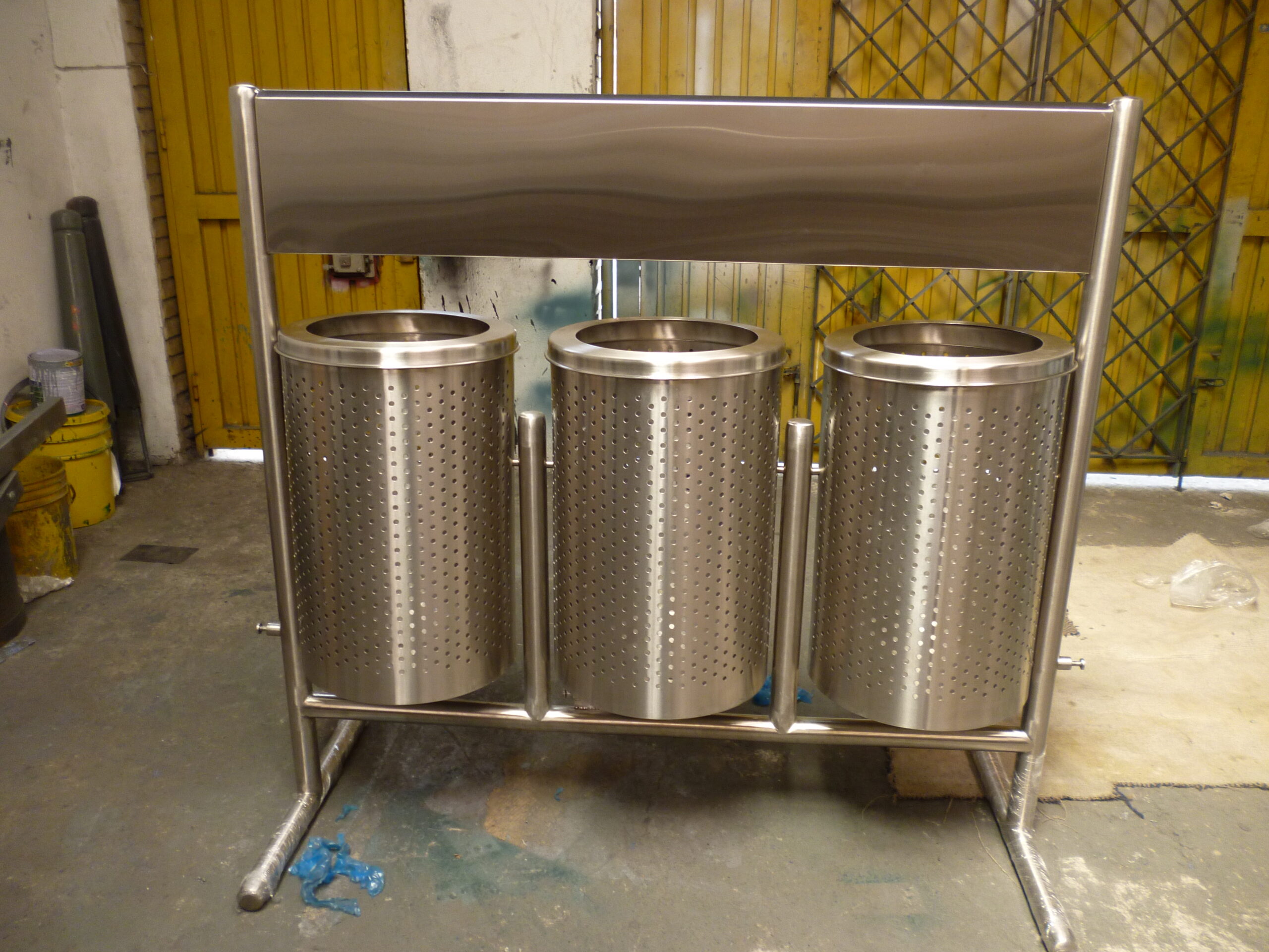 Juego de tres Canecas Elaboradas en Acero Inoxidable y mecanismo de Vaciado con tapa pisabolsa Anti vandálico Diámetro cilindro 40cm con bandeja informativa para reciclaje en plotter de corte