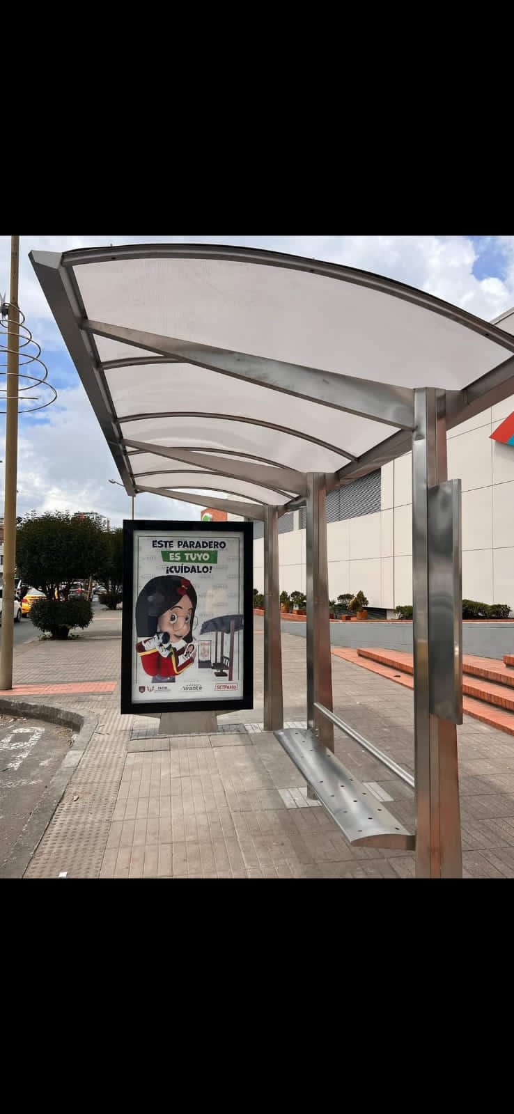 Elaborado en lamina de acero inoxidable 304, techo en policarbonato alveolar color opal, banca en lamina micro perforada.