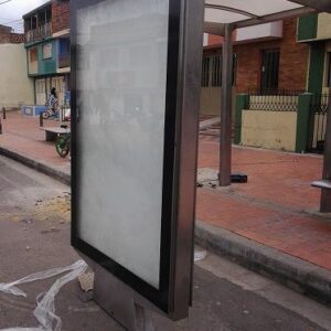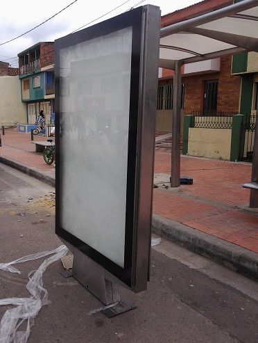 Mueble Urbano de Publicidad Integrada. Elaborado en Acero inoxidable, con vidrios de seguridad templado y sistema de iluminacion por ambas caras