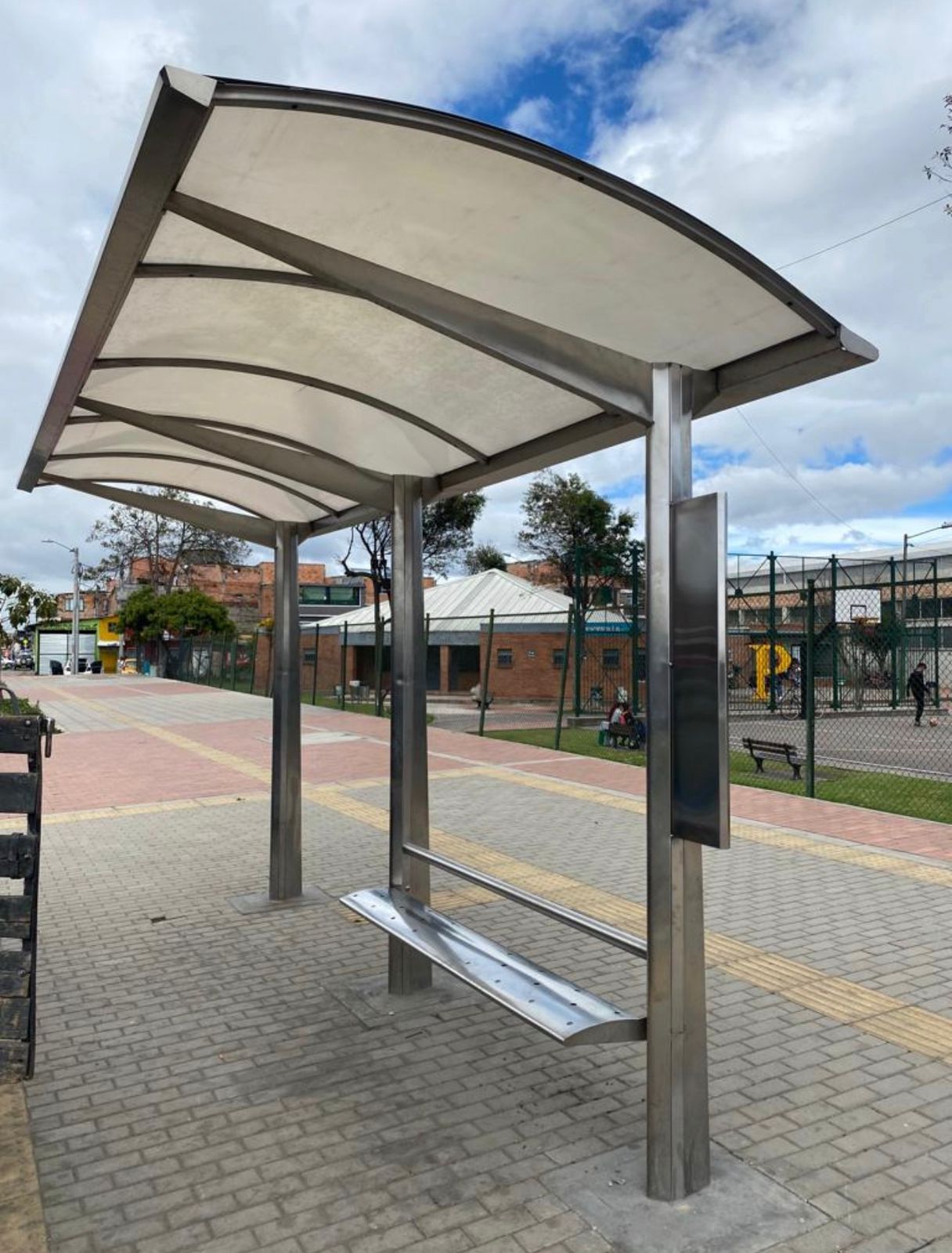 Elaborado en lamina de acero inoxidable 304, techo en policarbonato alveolar color opal, banca en lamina micro perforada.