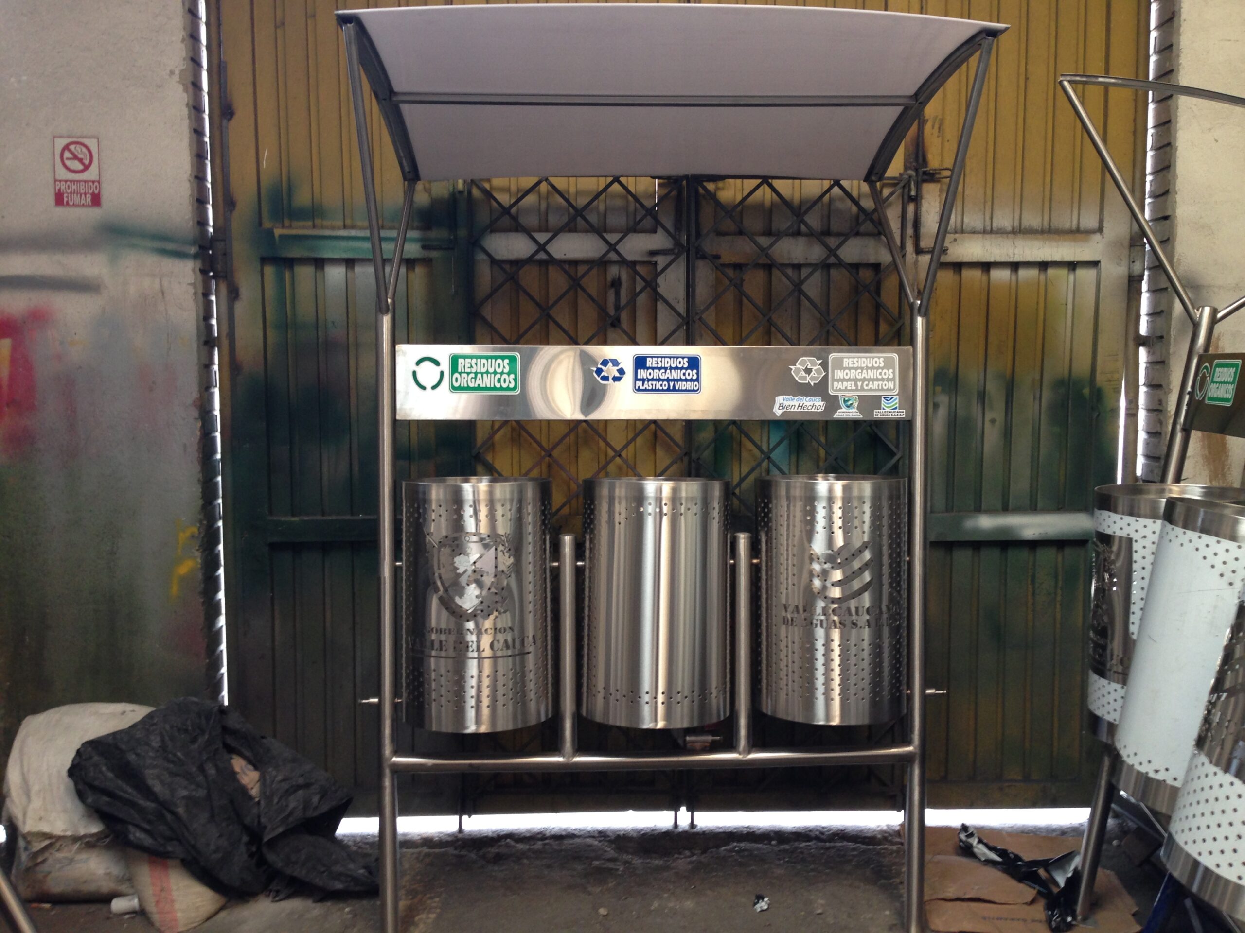 Juego de tres Canecas Elaboradas en Acero Inoxidable y mecanismo de Vaciado  con tapa pisabolsa Anti vandálico Diámetro cilindro 40cm con bandeja informativa para reciclaje en plotter de corte Incluye techo en policarbonato alveolar